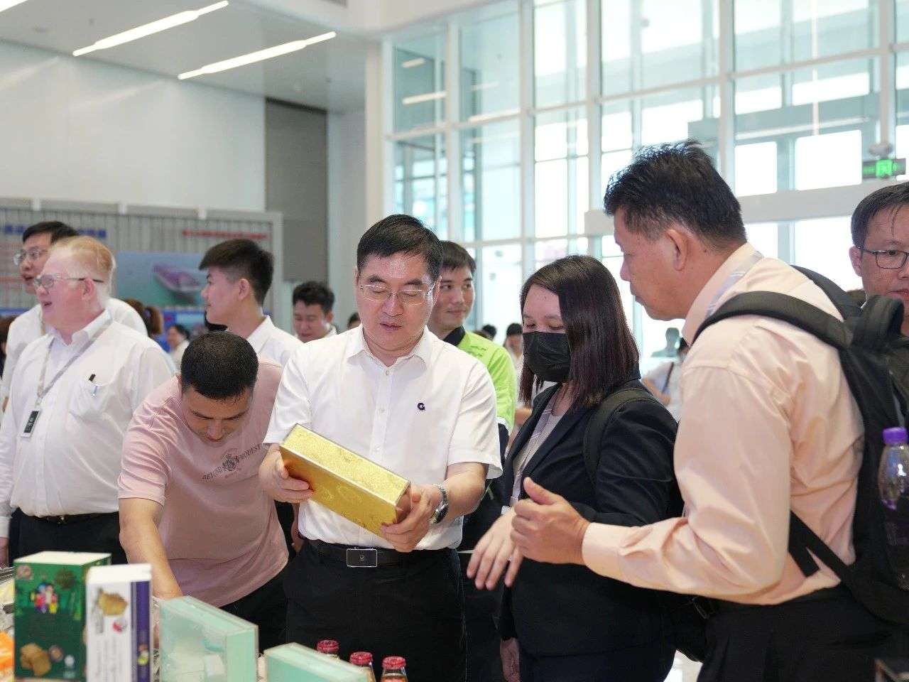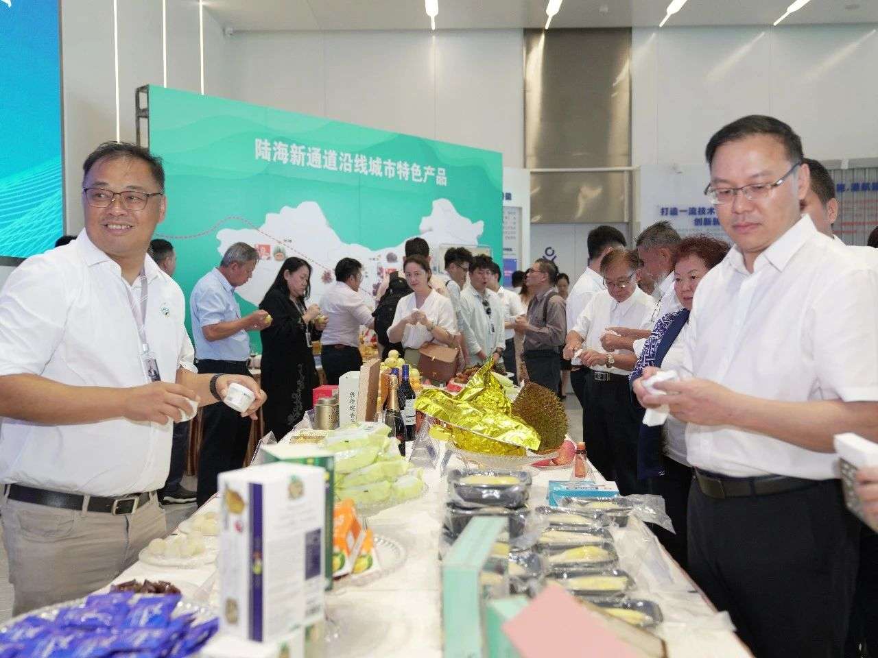 在自动化集装箱码头创新中心,“关丹港—北部湾港—中国川渝”多式联运航线特色产品展示暨陆海新通道—马来西亚彭享州特色农产品品鉴会人潮涌动,热闹非凡。