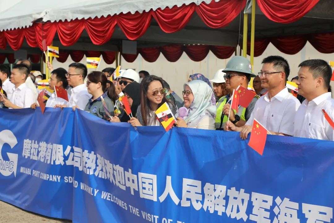 当地时间5日上午8时30分,悬挂中文两国国旗的“戚继光”舰缓缓靠上摩拉港码头。中国驻文莱大使肖建国、大使馆全体馆员、当地华社和学生代表、中资机构代表、文莱海军官兵等500余人到码头迎接。