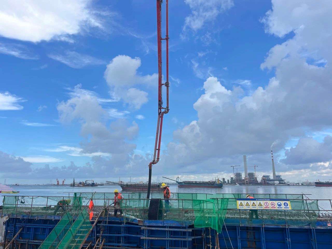 在东岸码头工地现场,工人们正井然有序地进行码头上部结构胸墙、轨道梁现浇混凝土浇筑工作。作为该项目建设工程关键任务之一,共需现浇212段,现浇混凝土总量约35000m³。胸墙内需预埋门机轨道螺栓、系船柱、橡胶护舷等预埋件,各专业预埋量大、材料多、内容复杂。