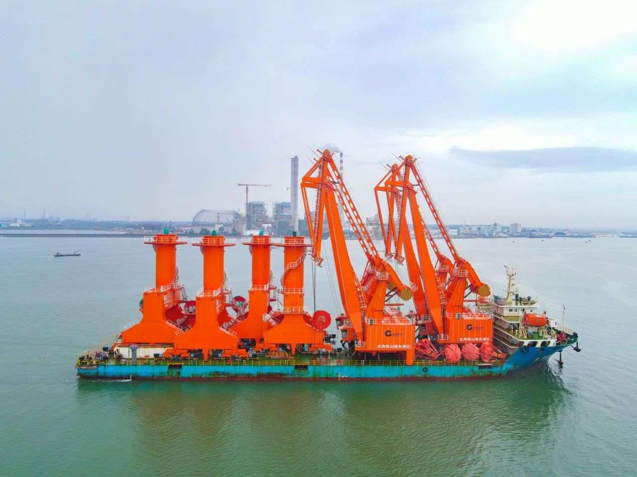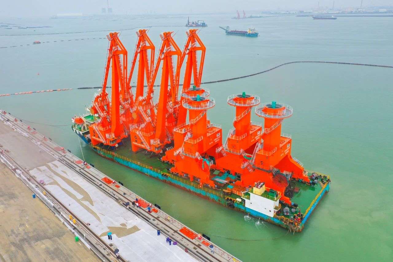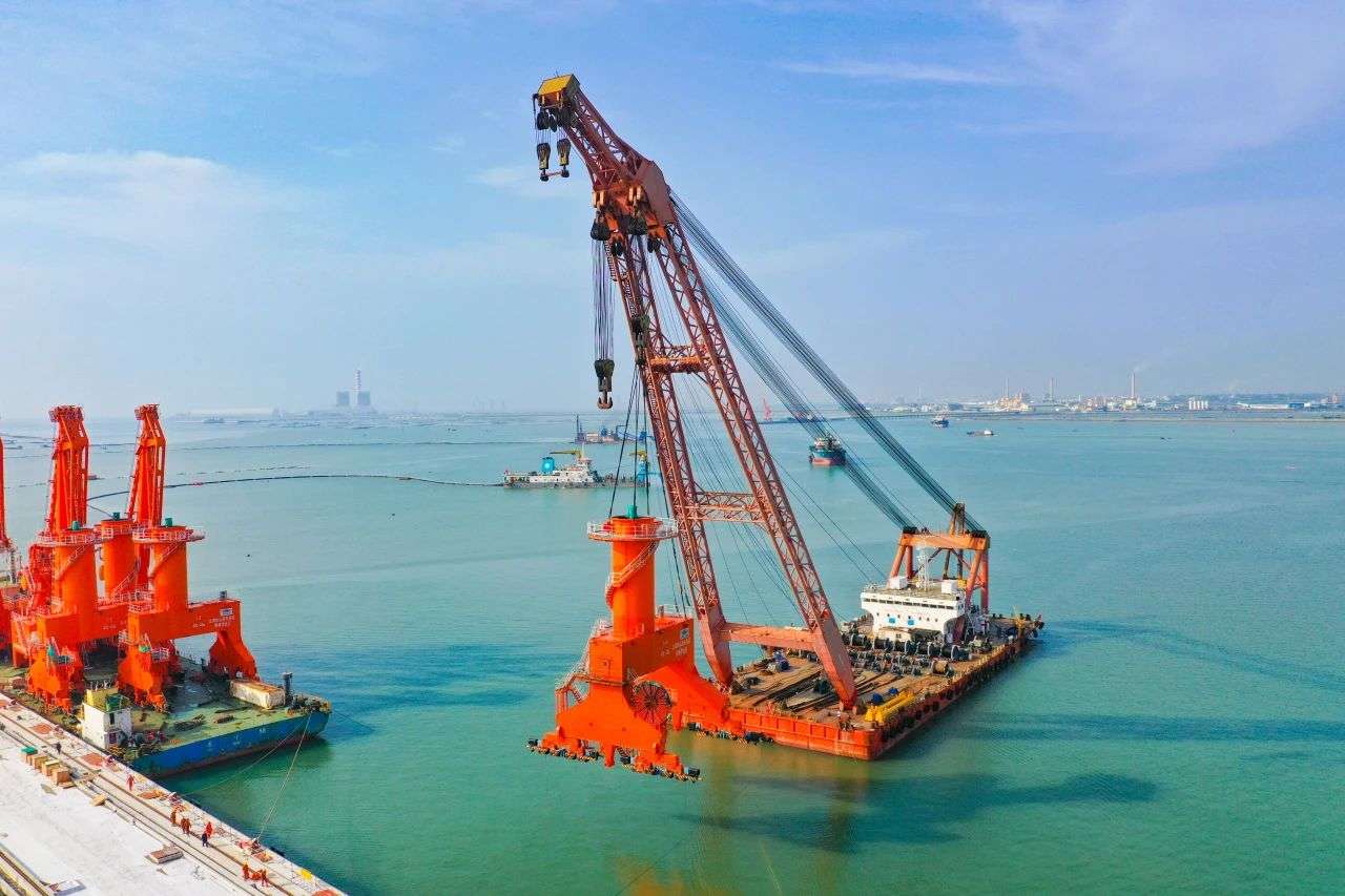 在1000吨级浮吊船紧张有序的起吊下,6台门机依次安全平稳地在指定位置完成卸船上岸,为扎实推进东岸码头的投产运行按下快进键。