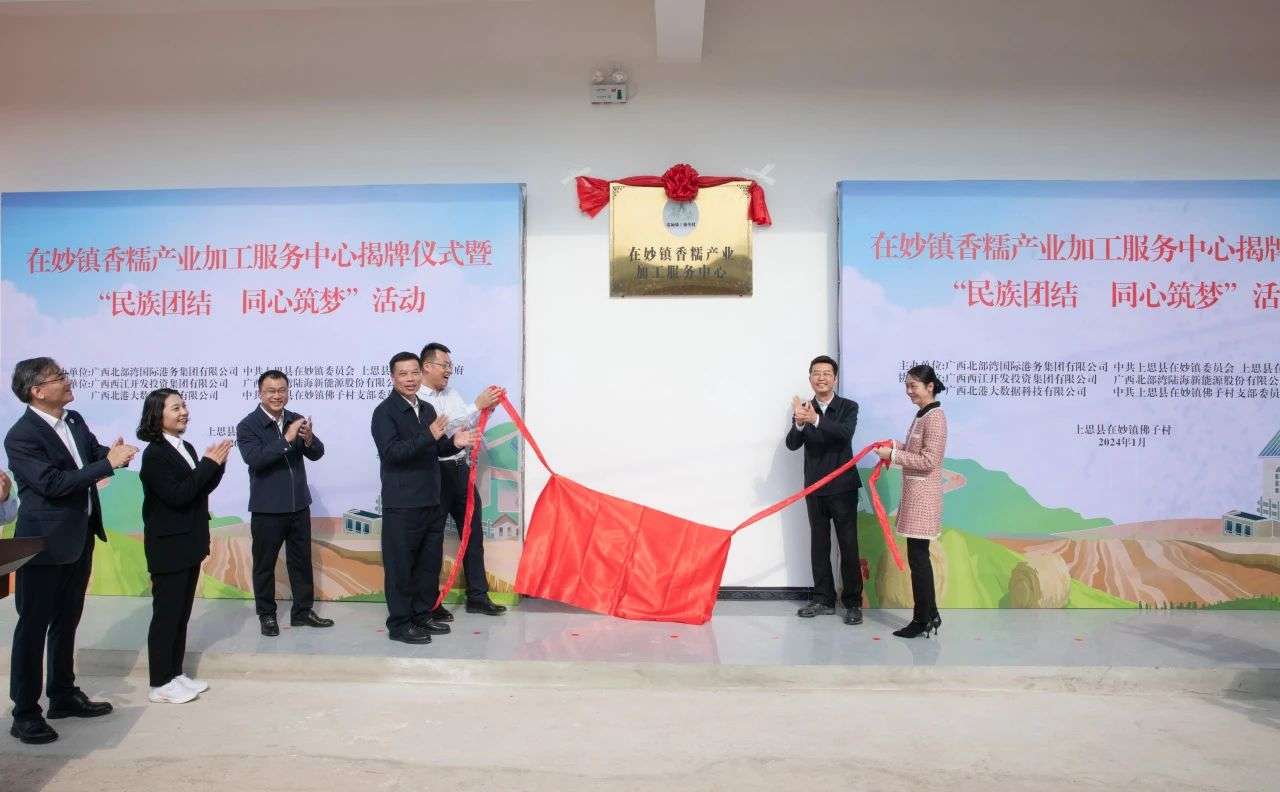 为深入学习贯彻落实习近平总书记对广西重大方略要求,持续推动打造西部陆海新通道全国民族团结进步示范长廊,巩固深化“铸牢中华民族共同体意识示范点”创建成效。今天(1月19日),集团公司党委书记、董事长周少波深入帮扶联系点防城港市上思县在妙镇佛子村,开展香糯产业加工服务中心揭牌仪式暨“民族团结 同心筑梦”活动,促进民族团结与乡村振兴工作同步发力,同频共振。集团公司党委副书记、工会主席、职工董事谢志双出席活动并致辞。